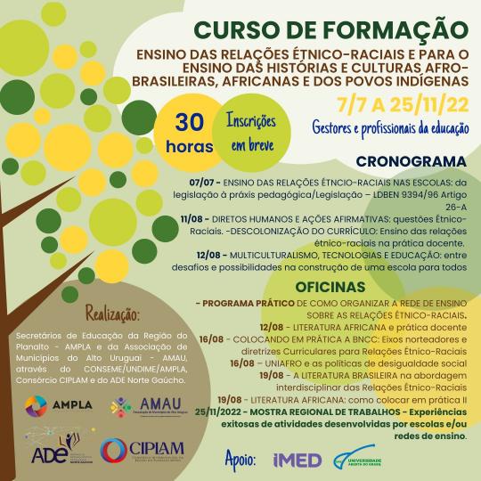 REALIZAÇÃO: Secretários de Educação da Região do Planalto - AMPLA e da Associação de Municípios do Alto Uruguai - AMAU, através do CONSEME/UNDIME/AMPLA, UNCME (União dos Conselhos Municipais de Educação), Consórcio CIPLAM e do ADE Norte Gaúcho, decidiram pela realização do I Curso de Formação para o Ensino das Relações Étnico-Raciais e para o Ensino das Histórias e Culturas Afro-Brasileiras, Africanas e dos Povos Indígenas em formato interregionalizado e na modalidade remota.